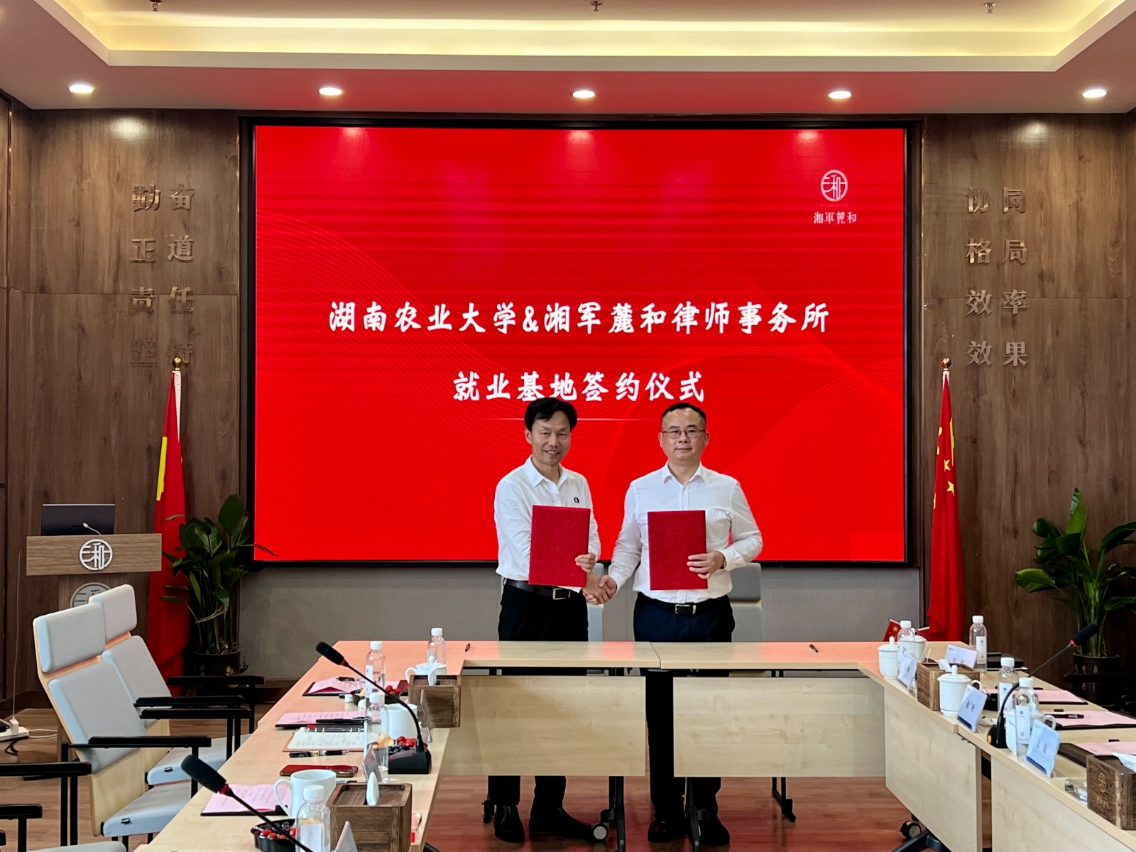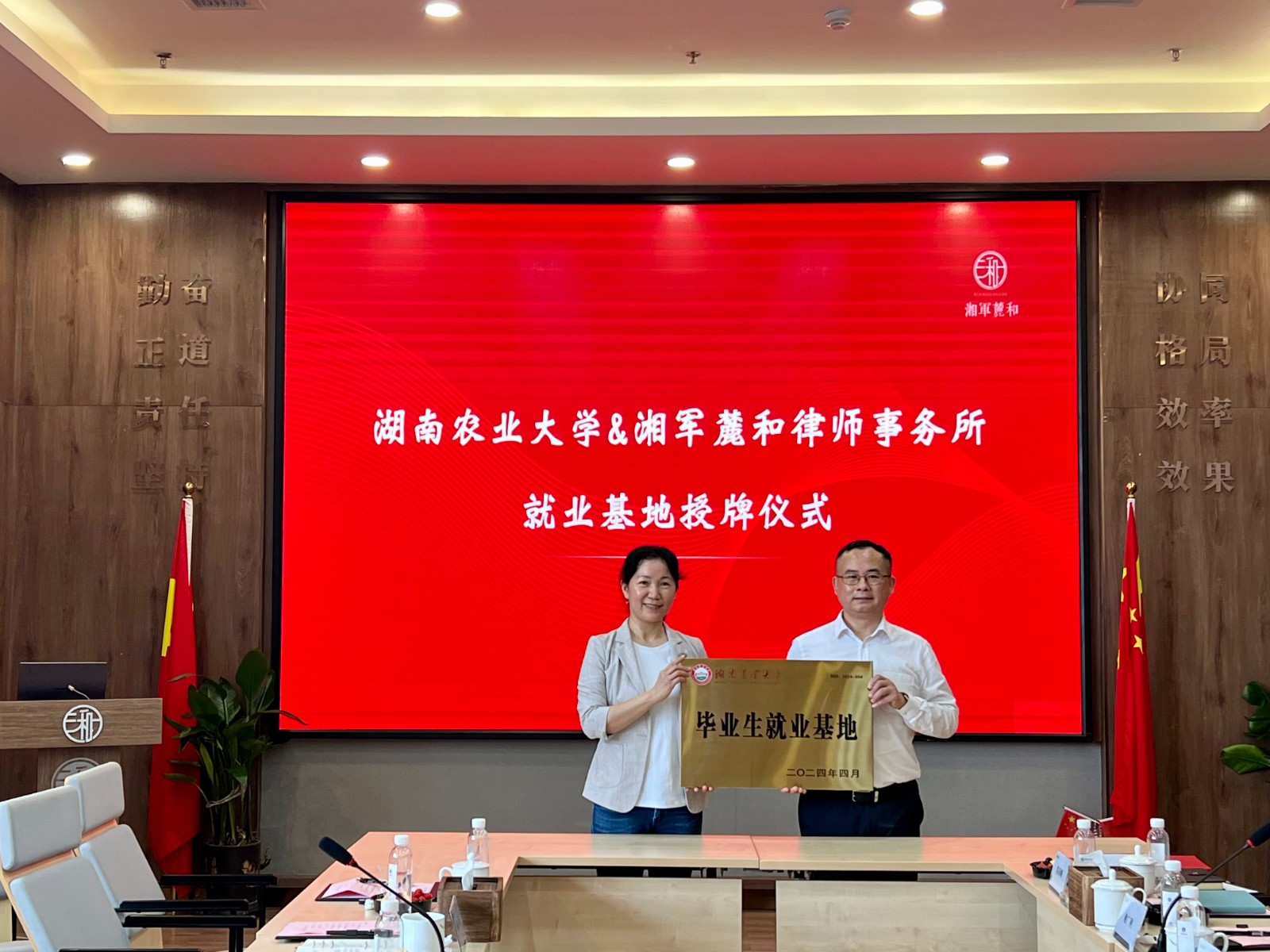 最后,院所双方在课程教学、实习实践、就业指导等多方面达成合作共识,贺林波代表公司与湘军麓和律所签署了毕业生就业基地合作协议,林丽娅代表公司为湘军麓和律所授予毕业生就业基地牌匾。